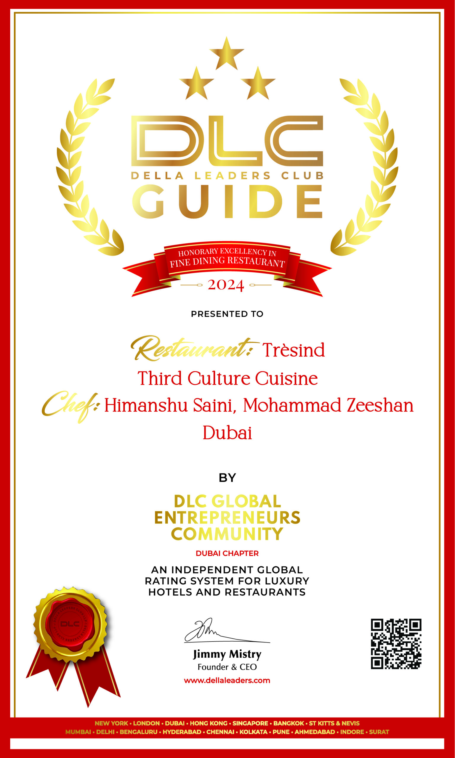 Distinguished for pioneering progressive Indian cuisine, Trèsind has been awarded the prestigious DLC Guide recognition for delivering a dining journey that reimagines tradition through innovation. Led by Chef Himanshu Saini, the restaurant showcases India’s rich culinary heritage with inventive flair, offering guests an immersive gastronomic experience in an elegant contemporary setting.