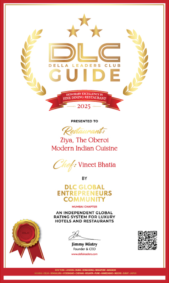 Celebrated for its modern Indian culinary expression, Ziya at The Oberoi has been awarded DLC Guide recognition for delivering a dining experience that blends classical Indian flavours with contemporary technique. Under the culinary direction of Chef Vineet Bhatia, the restaurant offers a refined and elegant setting where precision, balance, and thoughtful presentation come together to create a memorable fine-dining experience.